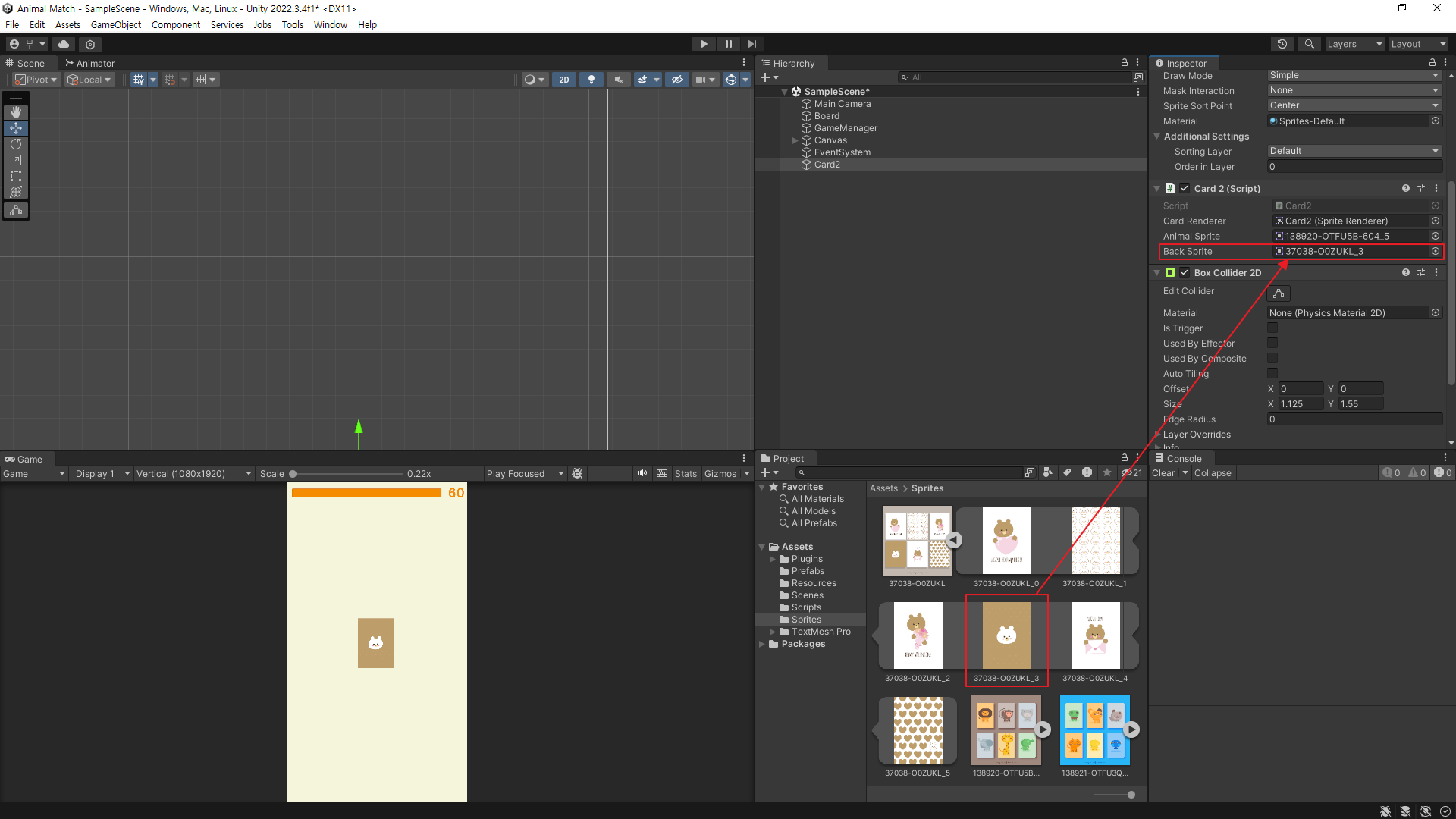 ③ Card 스크립트에 있는 BackSprite 오브젝트에 뒷면 카드 Spirte를 넣는다.