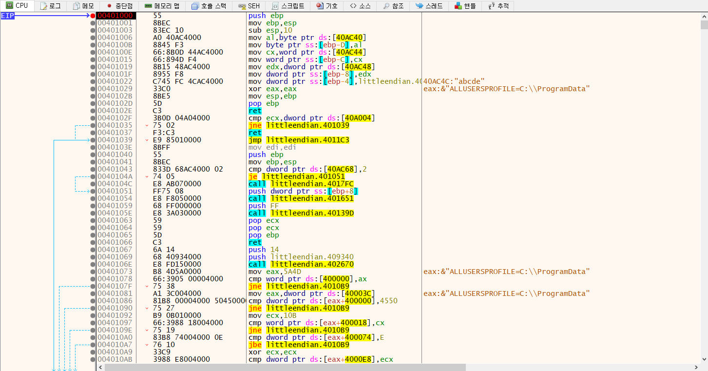 위 코드를 빌드하여 만든 LittelEndian.exe를 x64dbg로 디버깅 합니다. Go to명령[Ctrl + G]으로 401000 주소로 갑니다.