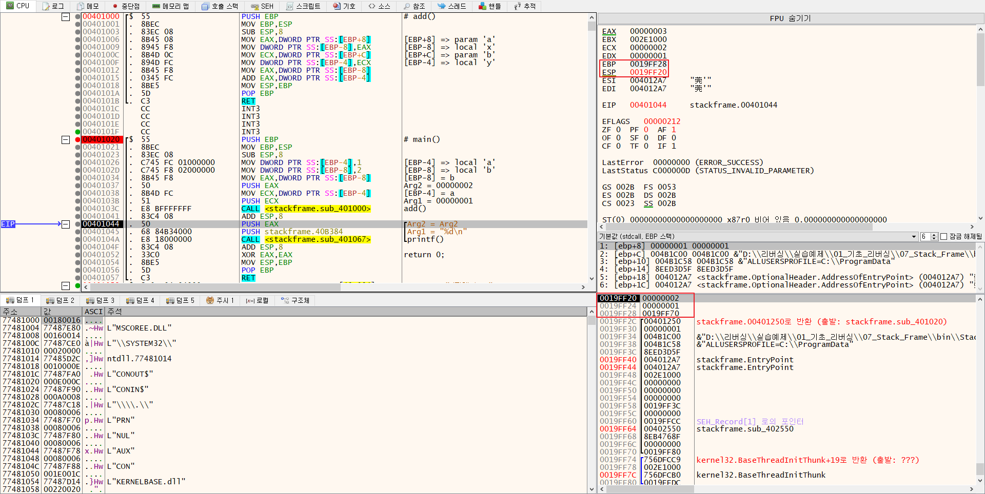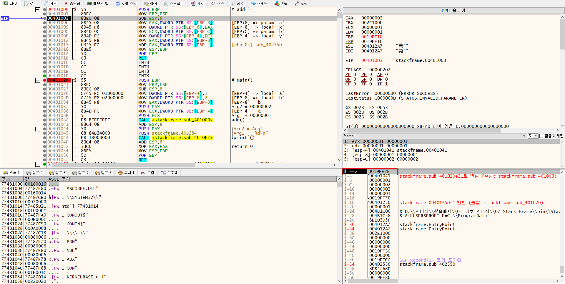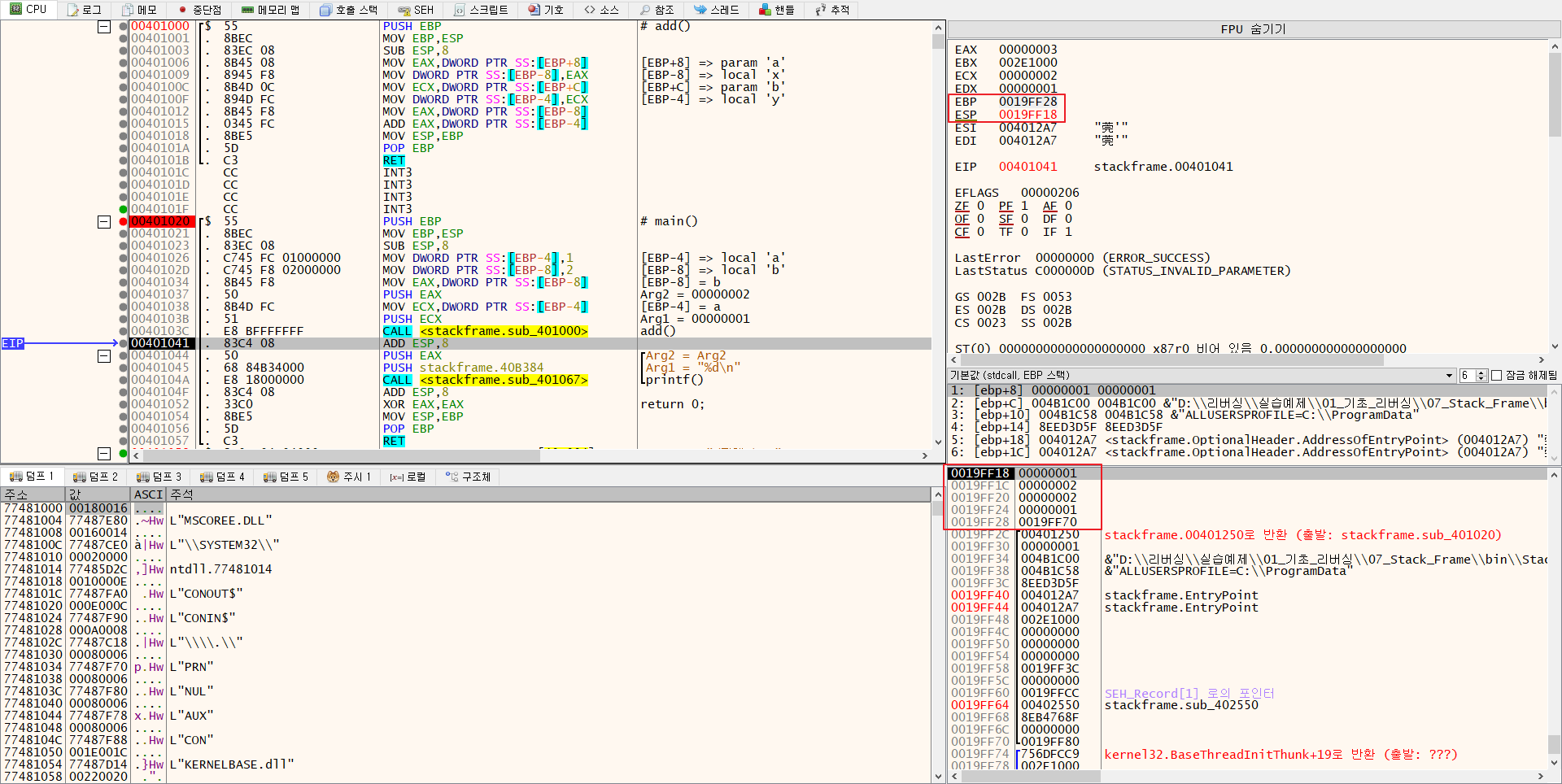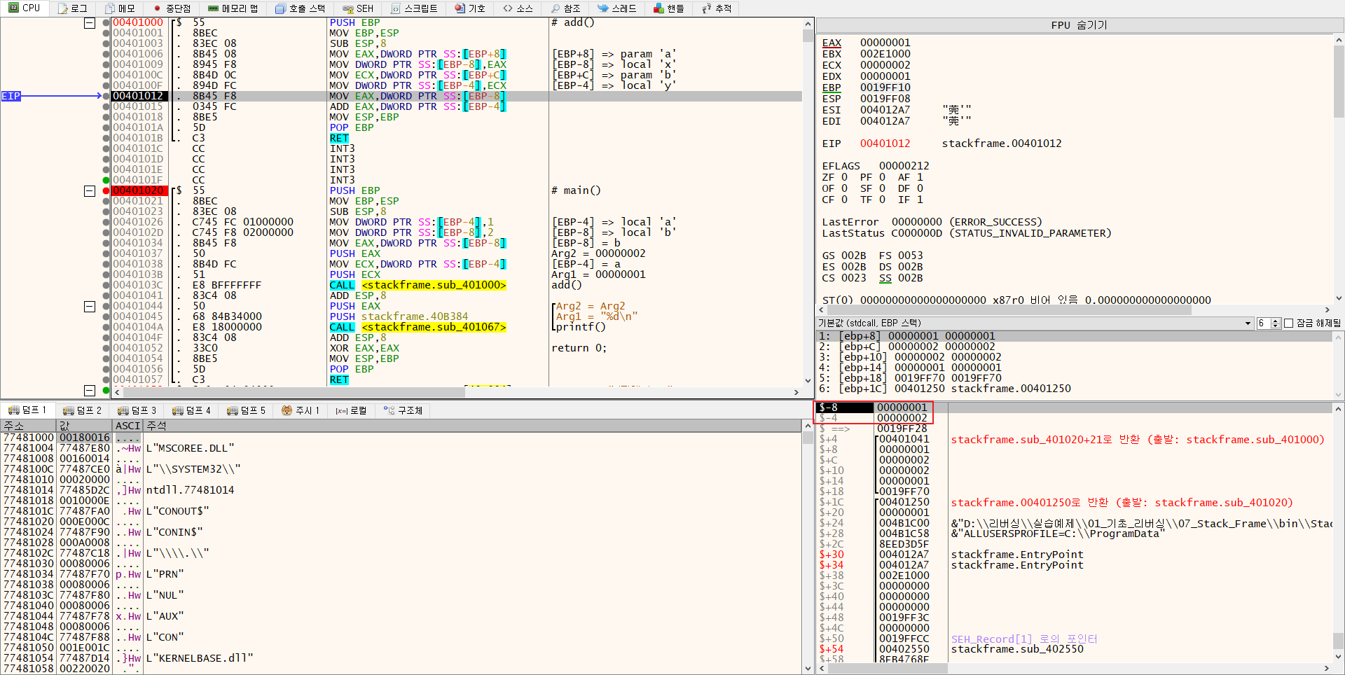 add() 함수에서 새롭게 스택 프레임이 생성되면서 EBP 값이 변하였습니다. [EBP+8], [EBP+C]가 각각 파라미터 a, b를 가리킵니다. 그리고 [EBP-8], [EBP-4]는 각각 add() 함수의 로컬 변수 x, y를 의미합니다.