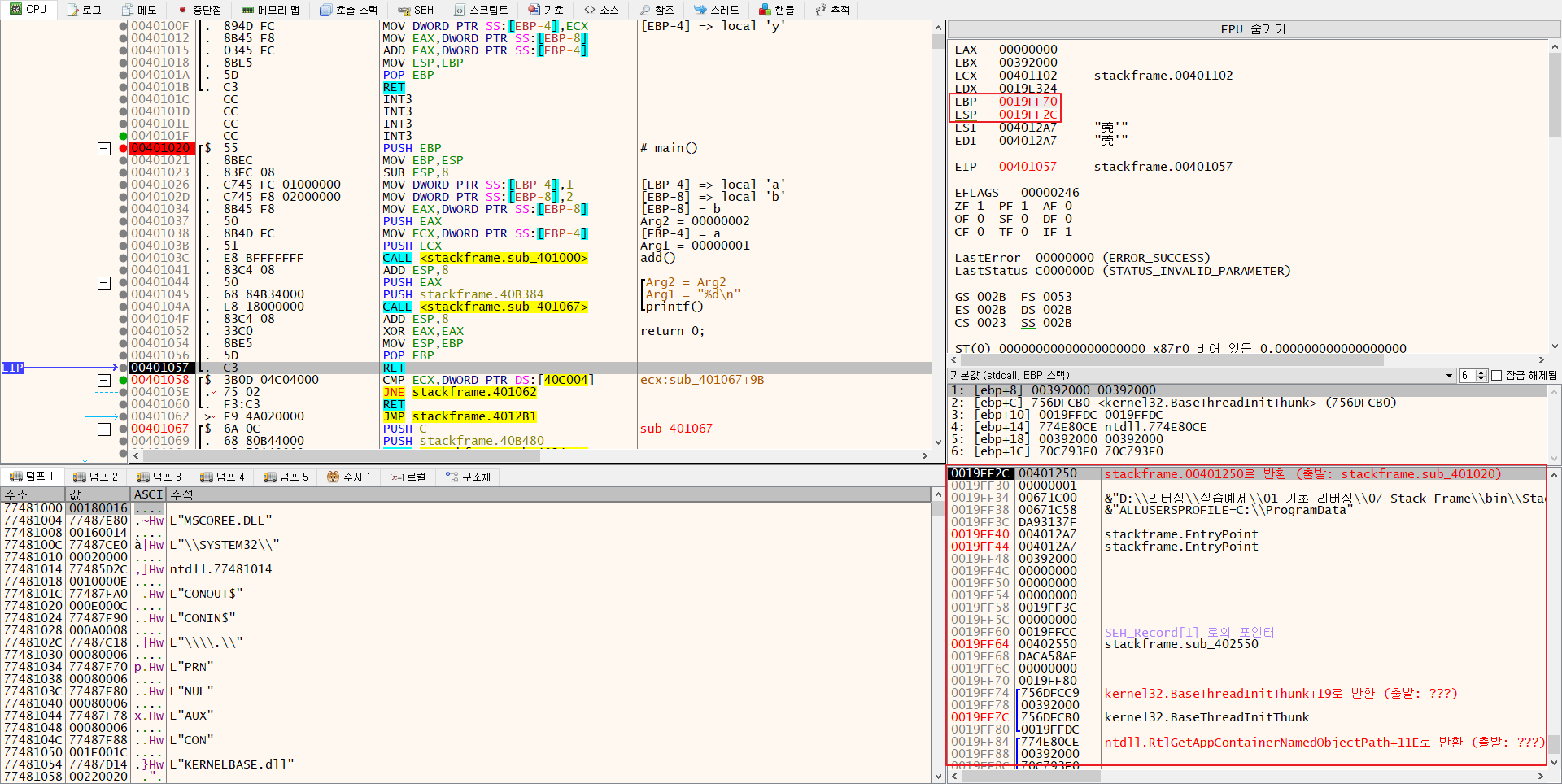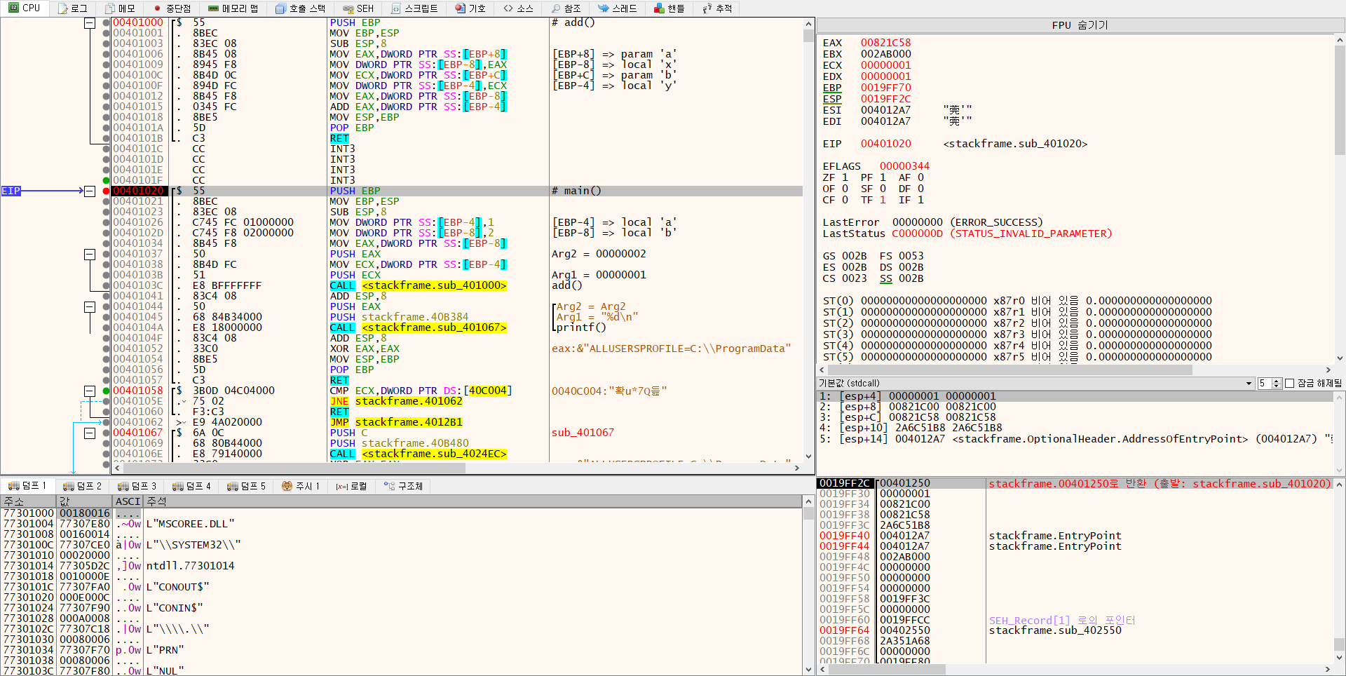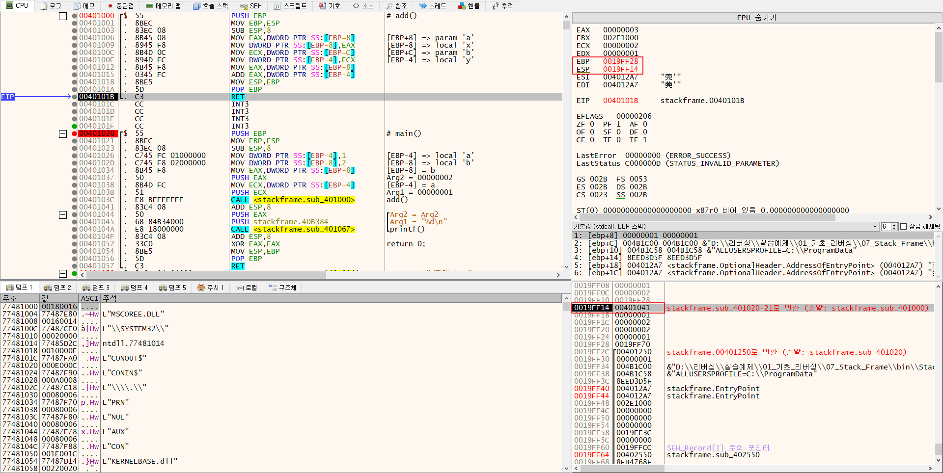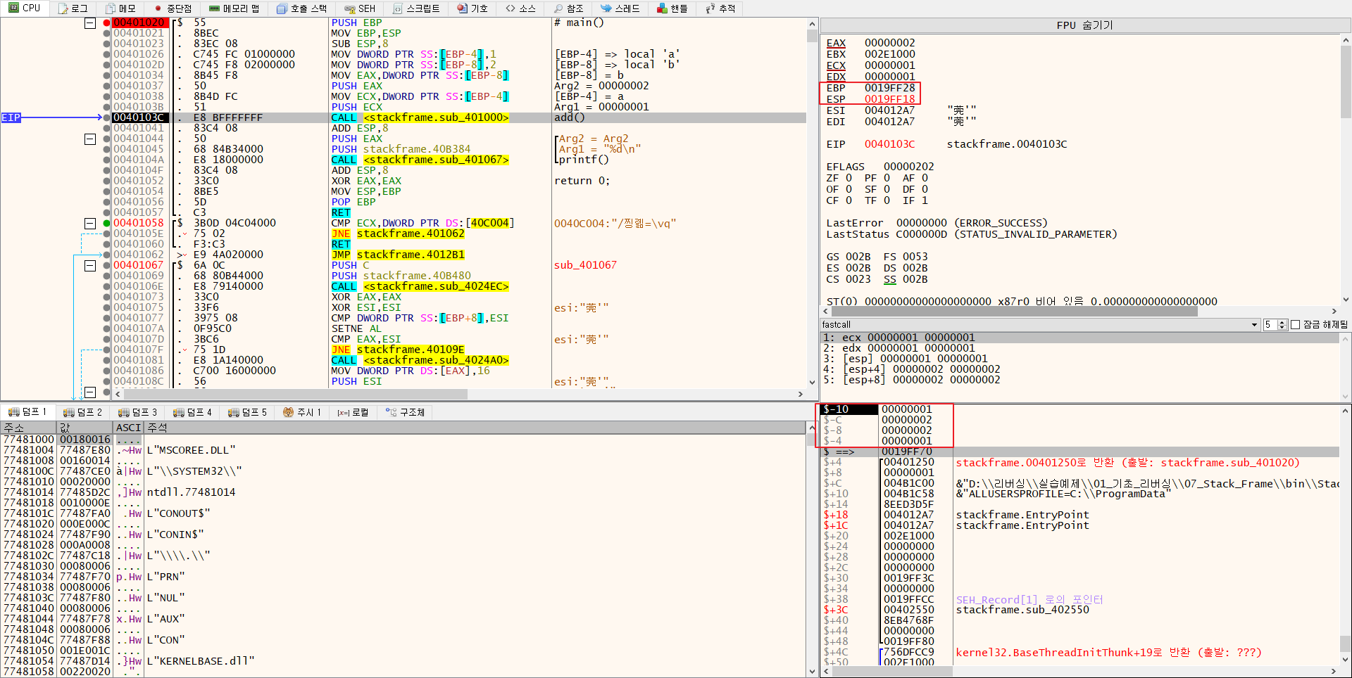 add() 함수에서 새롭게 스택 프레임이 생성되면서 EBP 값이 변하였습니다. [EBP+8], [EBP+C]가 각각 파라미터 a, b를 가리킵니다. 그리고 [EBP-8], [EBP-4]는 각각 add() 함수의 로컬 변수 x, y를 의미합니다.