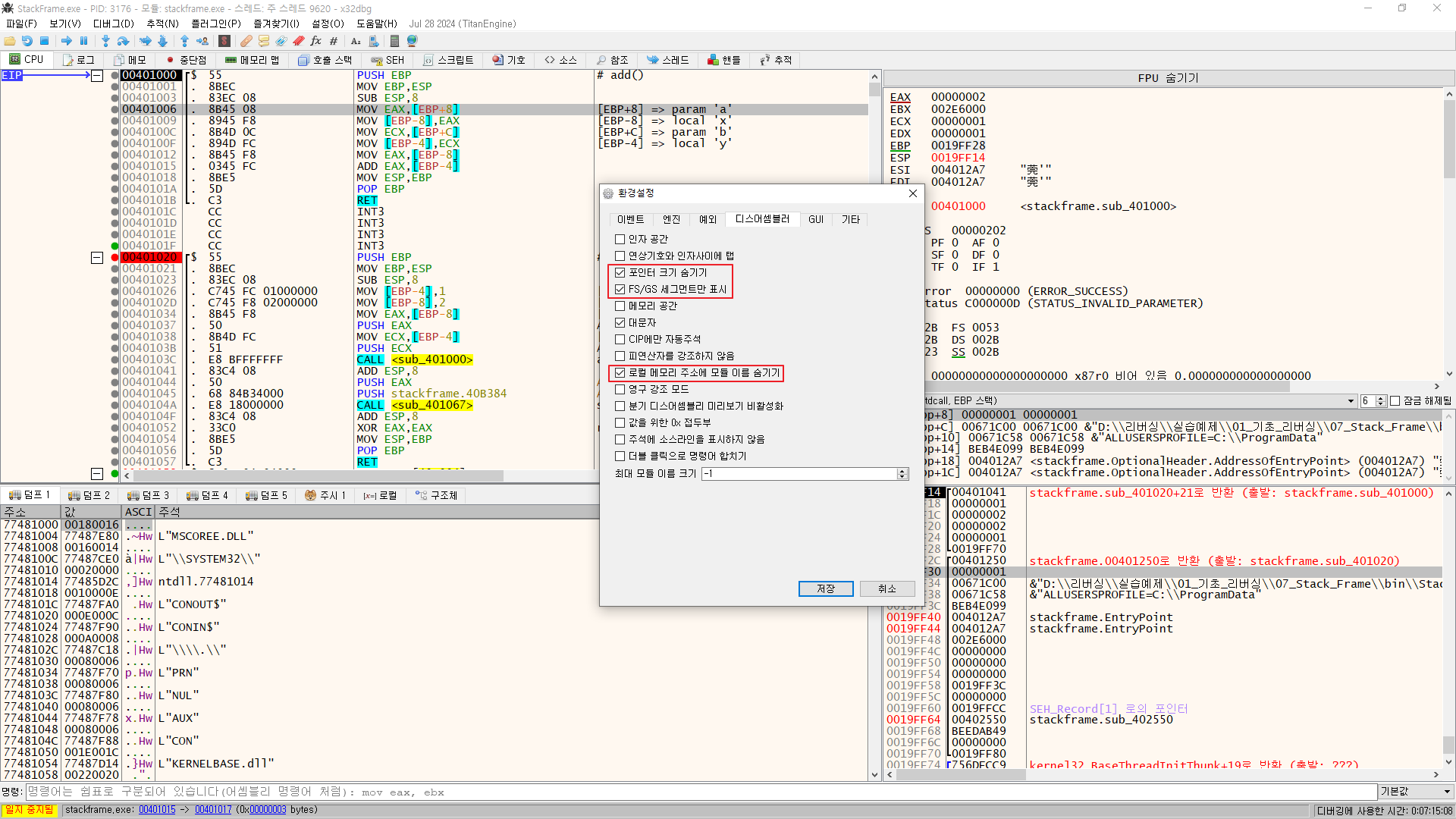 설정 -> 환경설정 -> 디스어셈블러를 눌러 위와 같이 체크합니다. 그럼 위의 그림 7.13과 같이 세그먼트 표시와 메모리 크기 표시가 사라집니다.