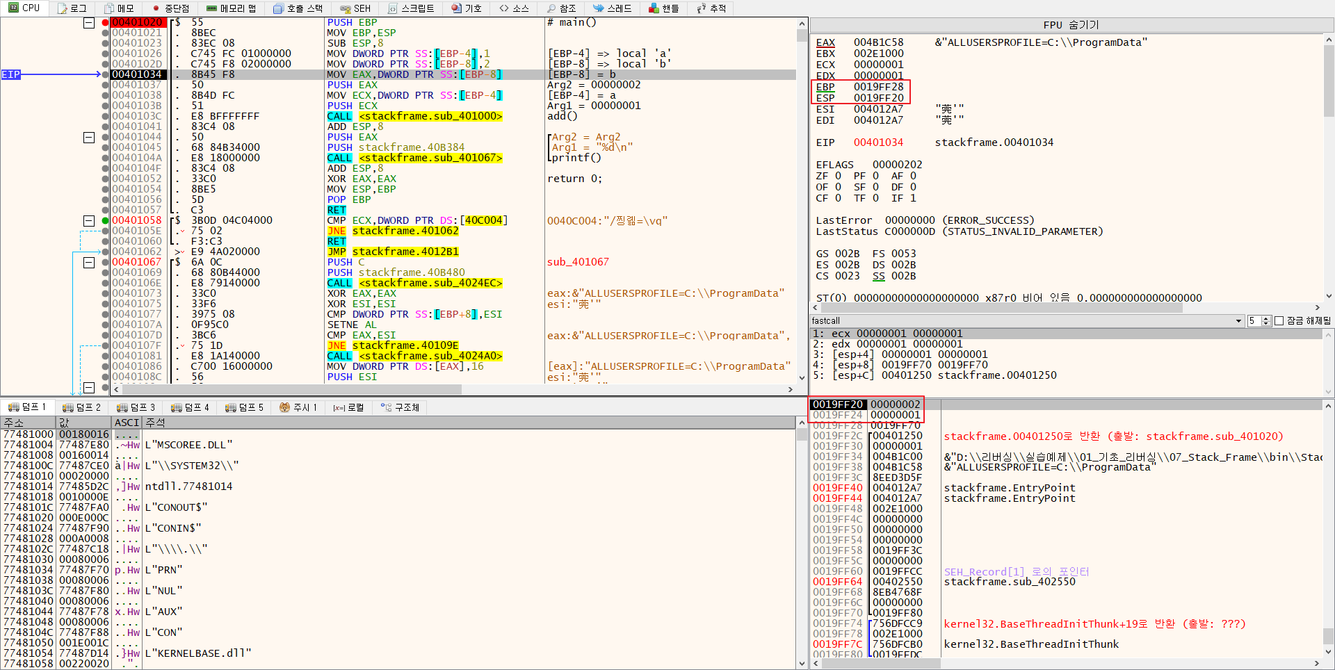 위 어셈블리 코드는 전형적인 함수 호출 과정을 보여줍니다. 40103C 주소의 CALL 401000 명령어에서 401000 함수가 바로 add() 함수입니다. 위 401034 ~ 40103B 주소의 코드에서 변수 a, b를 스택에 넣고 있습니다. 주목할 내용은 파라미터가 C언어의 입력 순서와는 반대로 스택에 저장된다는 것입니다.