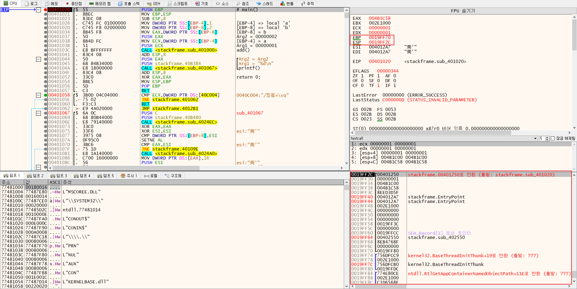 - EBP : 함수에서 사용될 스택의 기준 주소값