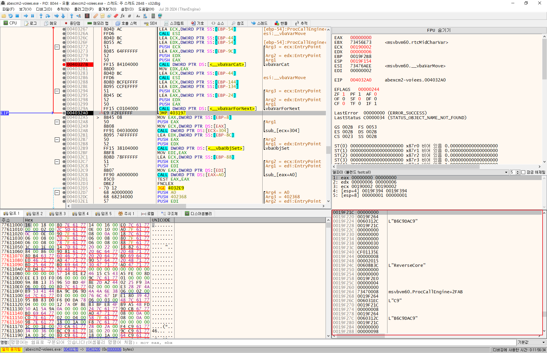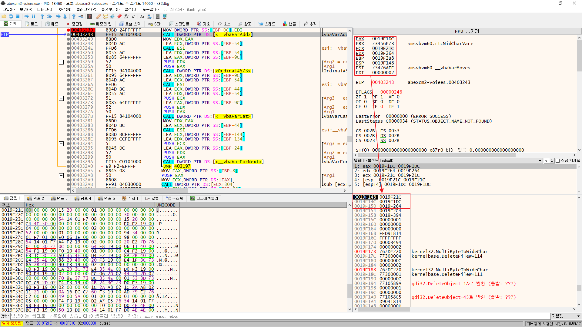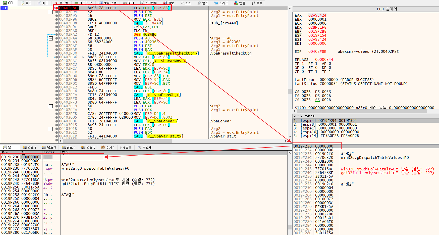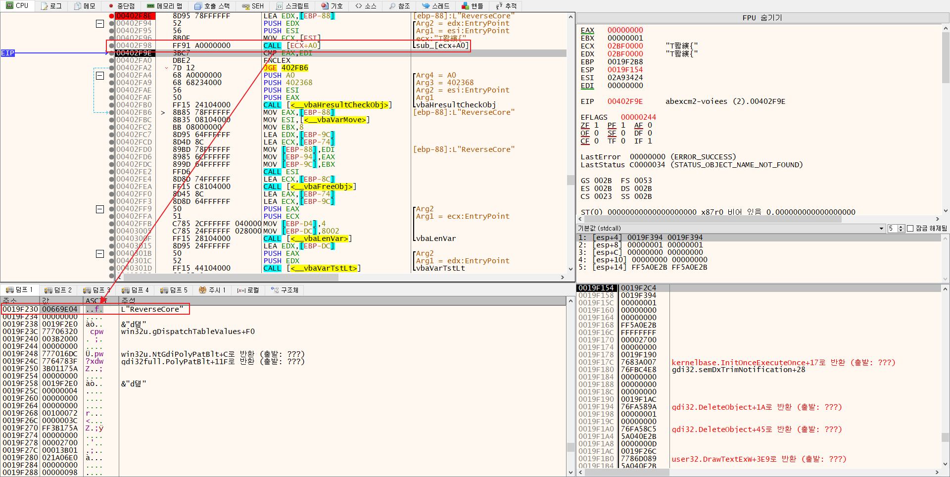 VB 엔진 API를 이용하여 사용자가 입력한 문자열을 가져올 것으로 예상되므로 CALL 명령어 위주로 디버깅 해보겠습니다. 디버깅을 진행하면 아래와 같은 4번째 CALL 명령어를 만나게 됩니다.