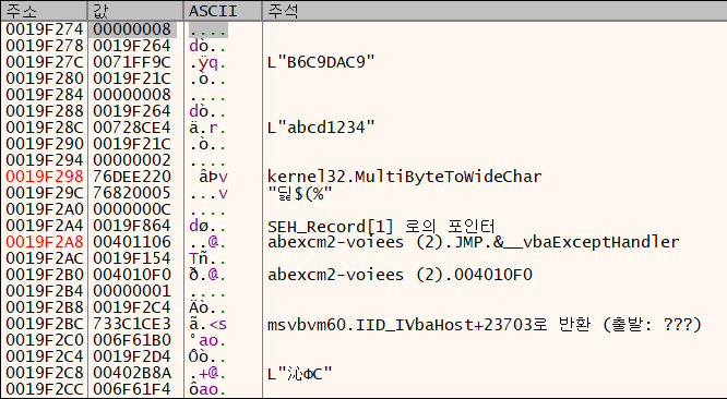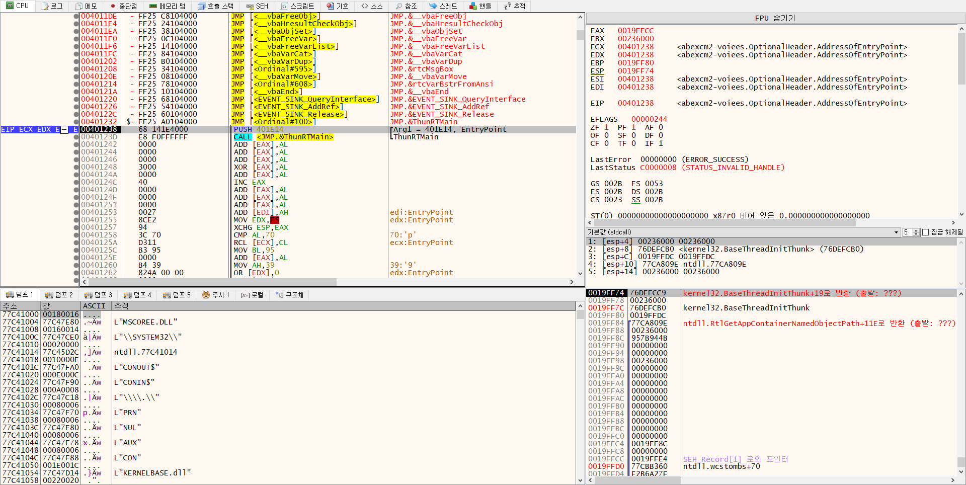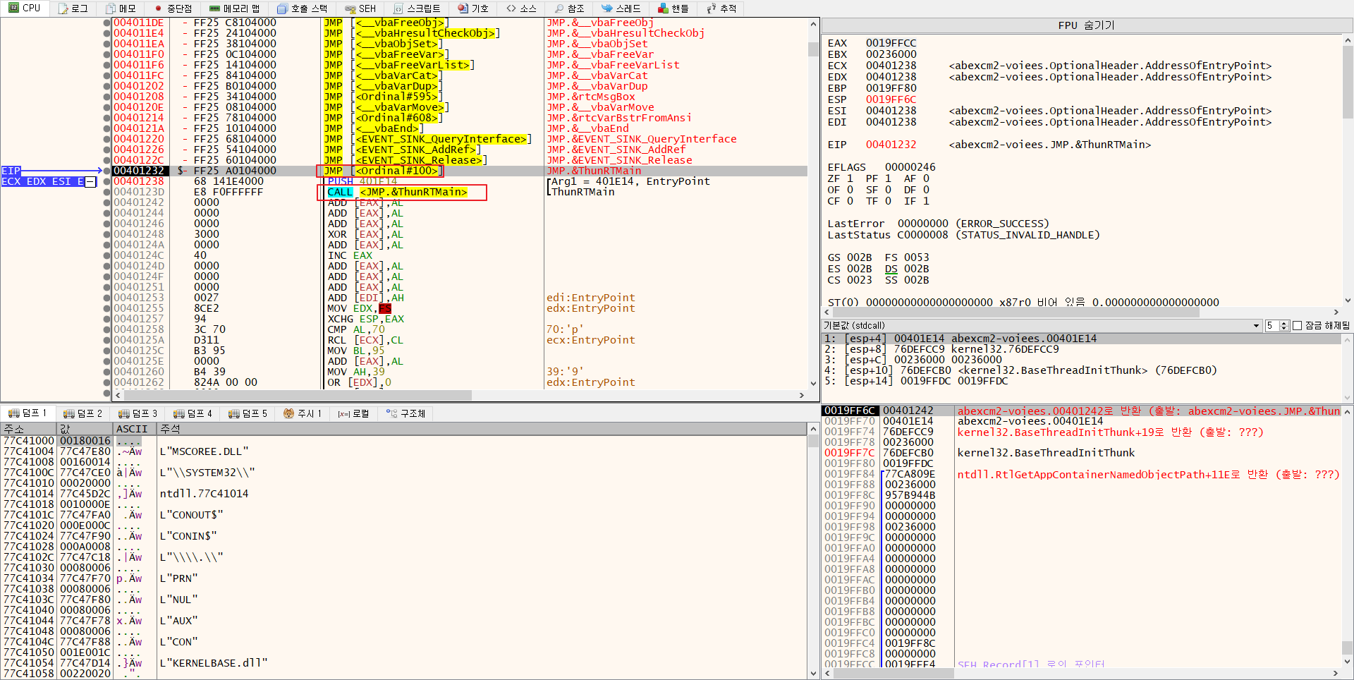 - 이 JMP 명령어에 의해서 VB 엔진의 메인 함수인 ThunRTMain() 함수로 갑니다.
