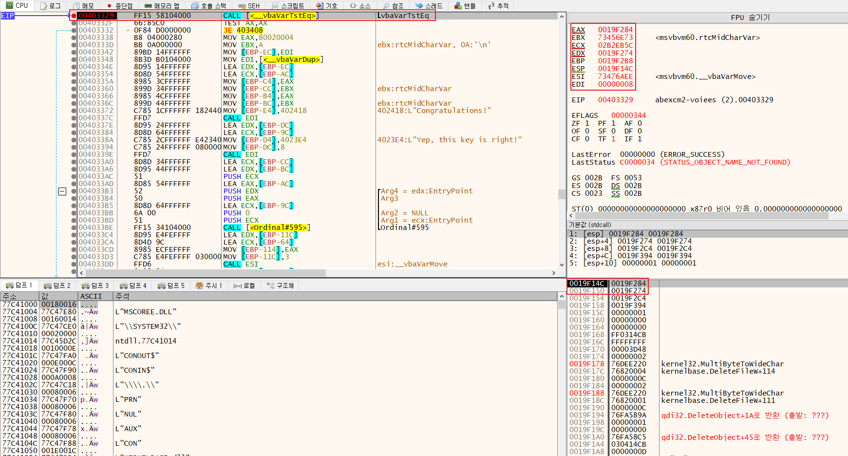 0040325B CALL DWORD PTR DS:[<Ordinal#573>] ; rtcHexVarFormVar() : 유니코드로 변경!