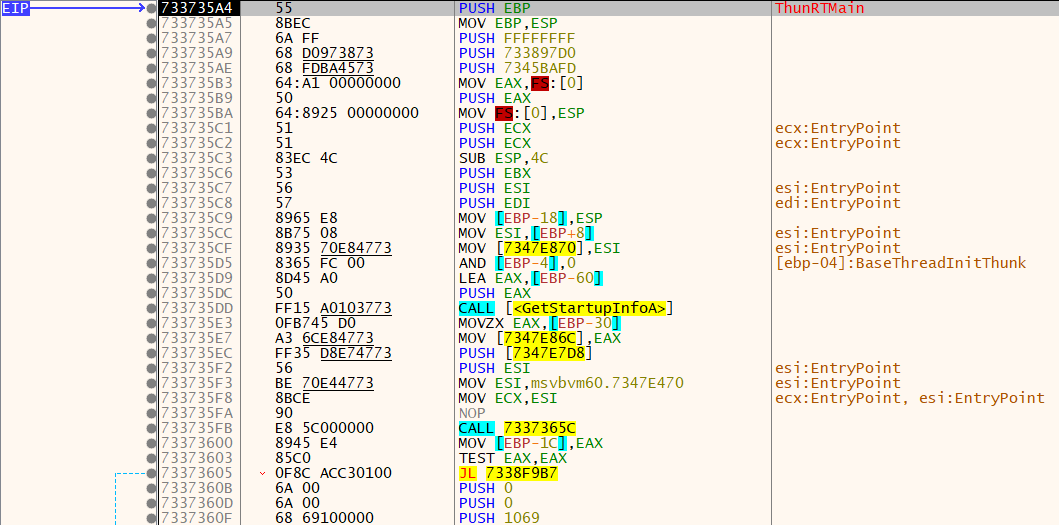 0040123D E8 F0FFFFFF CALL <JMP.&ThunRTMain> ; └ThunRTMain