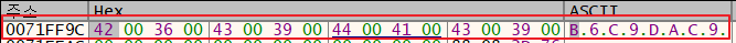 실제 문자열 주소(005E4404)를 보면 숫자 B6가 유니코드 문자열 "B6"로 변경되었습니다.