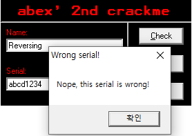 실행시켜 보면 시리얼 키를 알아내는 프로그램인걸 확인할 수 있습니다. Name을 따로 입력받는 걸로 봐서 Serial 값을 생성할 때 Name 문자열이 사용될 것으로 추측됩니다. 잘못된 값을 입력하면 "Wrong serial!" 메시지 박스가 출력되는걸 확인할 수 있습니다.