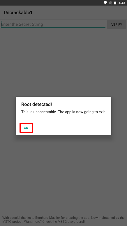 실행하면 루팅 탐지 알림이 뜨며 OK를 누르면 자동으로 앱이 종료된다.