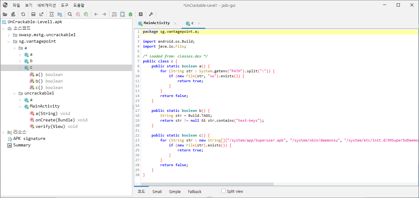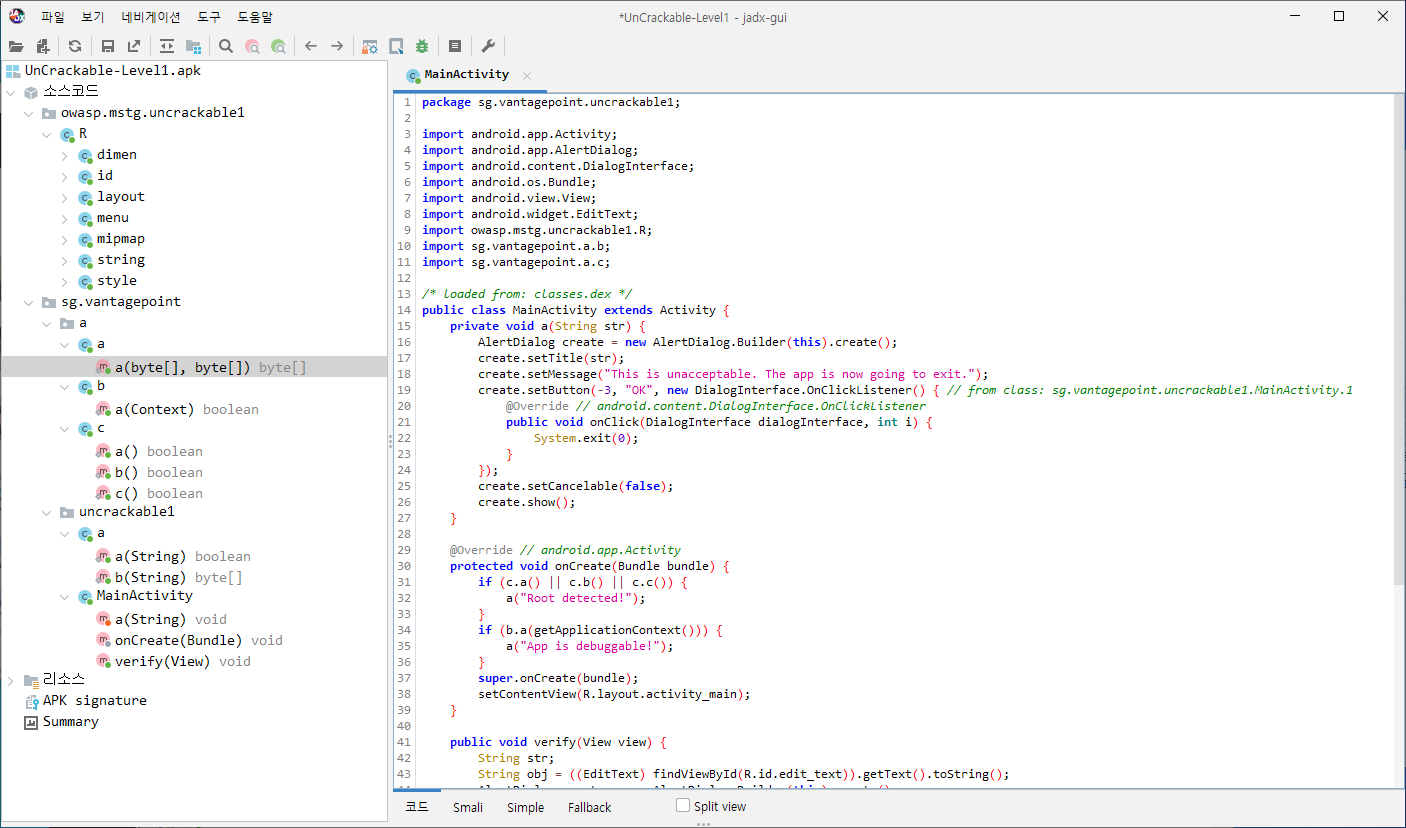 경로 : ~\APK Easy Tool v1.60 Portable\1-Decompiled APKs\UnCrackable-Level1\smali\sg\vantagepoint\uncrackable1\