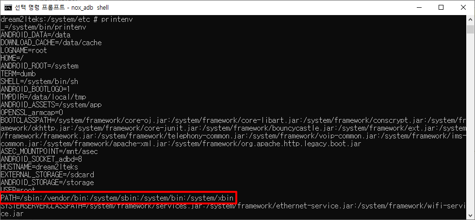 java.lang.System.getenv 메소드는 현재 시스템의 환경변수 값을 얻어오는 메서드이다.즉, 녹스에 있는 환경변수 값을 읽어 File.exists() 메소드를 통해 su 명령어(바이너리)가 존재하는지 판단하여 루팅 탐지를 수행한다. 녹스에 설정되어 있는 환경 변수를 확인해 보자.