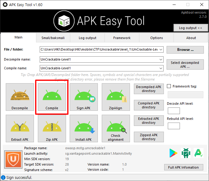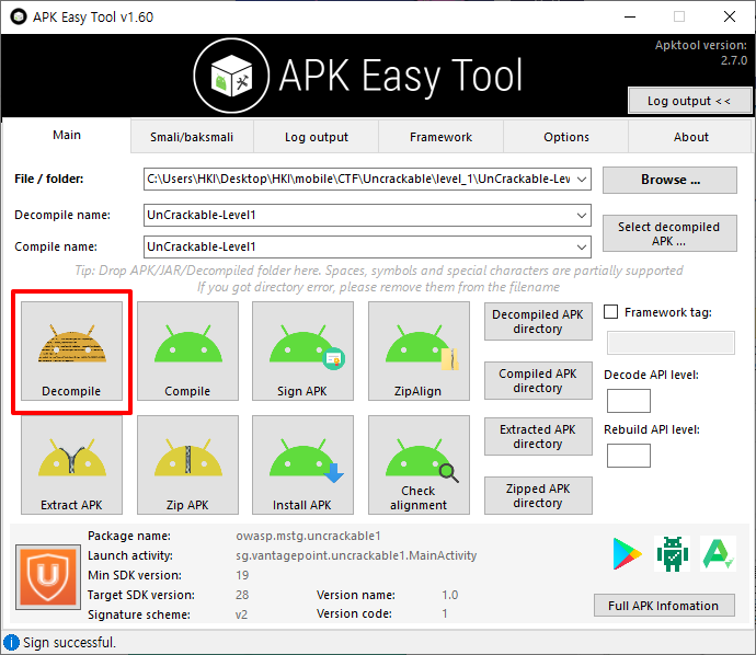 Step 3) APK Easy Tool을 활용하여 UnCrackable-Level1.apk를 디컴파일 한다.