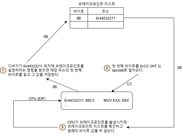 - 디버거는 특정 주소에 브레이크 포인터를 설정하라는 명령을 받으면 해당 주소의 첫 번째 opcode바이트를 읽어 그걸 저장하고 그 위치에 CC 바이트를 써 넣는다.
