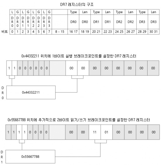 - 디버그 레지스터에 설정된 브레이크포인트 종류와 길이를 나타내는데 사용된다.
