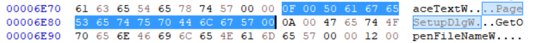 파일 오프셋 6E7A의 최초 2바이트 값(000F)은 Ordinal로, 라이브러리에서 함수의 고유 번호입니다. 그 뒤로 "PageSetupDlgW" 함수 이름 문자열이 보입니다.