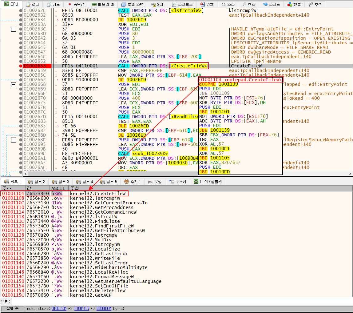 CreateFileW를 호출할 때 직접 호출하지 않고 01001104 주소에 있는 값을 가져와서 호출합니다. 01001104 주소는 notepad.exe에서 '.text' 섹션의 메모리 영역입니다. 01001104 주소의 값은 765733E0의 값을 가지며 이 765733E0 주소가 바로 notepad.exe 프로세스 메모리에 로딩된 kernel32.dll의 CreateFileW 함수 주소입니다.