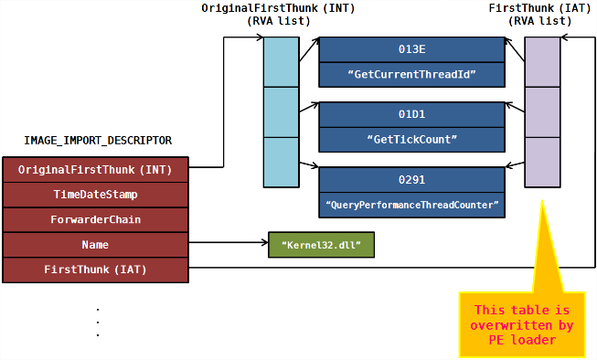 - 로더가 Import Descriptor Table에서 Name 필드를 읽어 "kernel32.dll"과 같은 문자열을 얻고, 해당 DLL을 LoadLibrary("kernel32.dll")로 로드합니다.