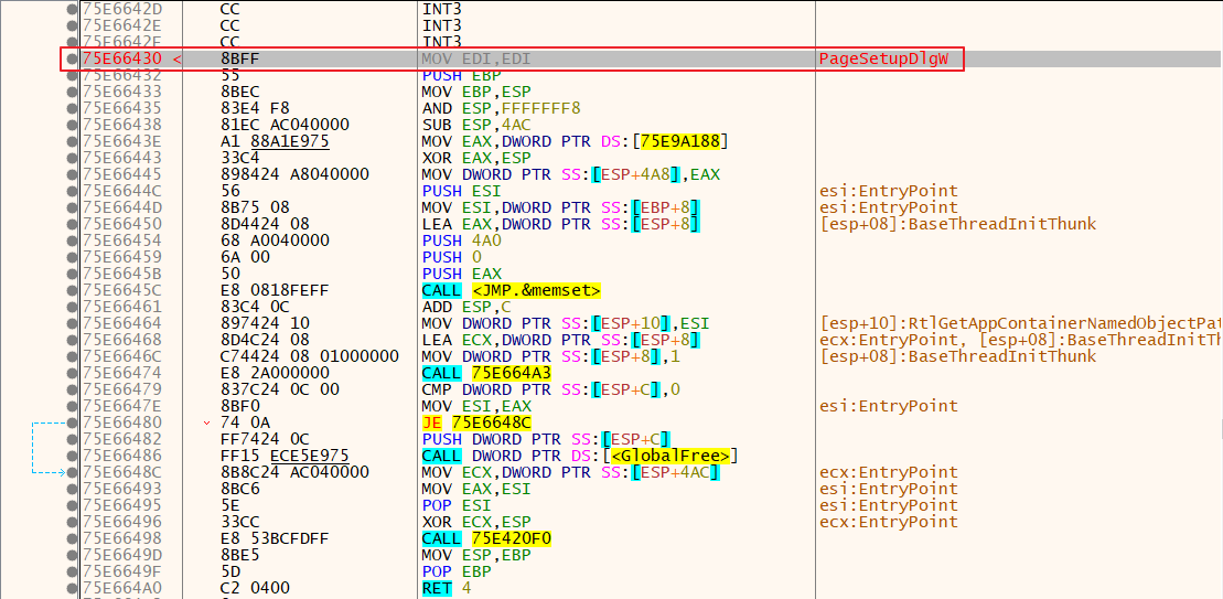 해당주소 75E66430으로 가면 아래의 그림과 같이 comdlg32.dll의 PageSetupDlgW 함수 시작이 나타납니다.