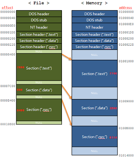 PE 파일이 메모리에 로딩되었을 때 각 섹션에서 메모리의 주소(RVA)와 파일 옵셋을 잘 매핑할 수 있어야 하는데, 이러한 매핑을 일반적으로 "RVA to RAW"라고 한다.