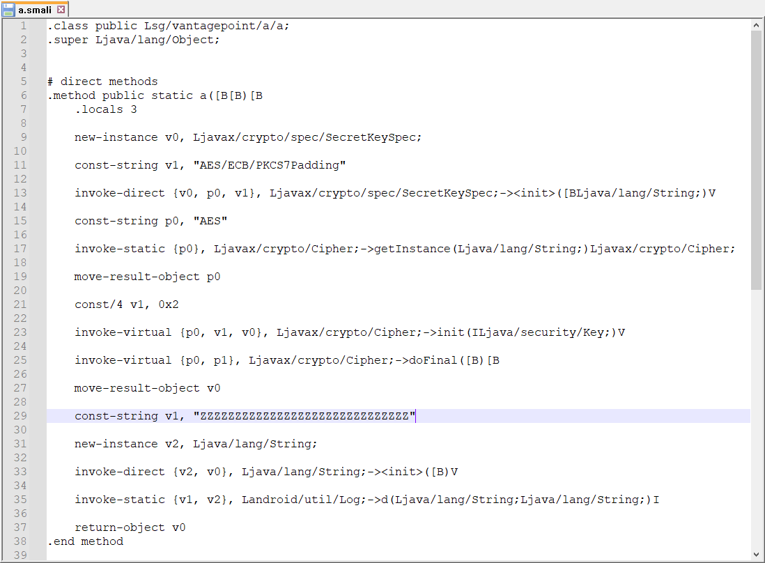 Step 5) 암복호화를 수행하는 sg.vantagepoint.a.a.a의 smail 코드를 확인한다.
